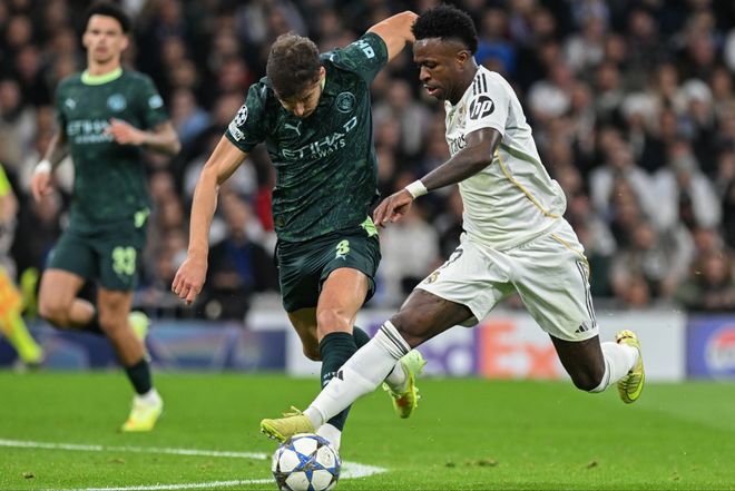 前场没了姆巴佩这尊大神,皇马运转的确流畅了许多。维尼修斯自不必多说,开场便身先士卒,险些为皇马赢得点球;罗德里戈一踢曼城就来劲,他甚至是皇马场上唯一状态和技术都优于对位对手的存在。